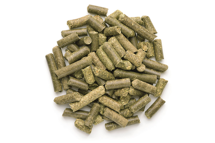牧草にはアルファルファ、オーツヘイなどの種類がありますが、チモシーが低カロリーで繊維質も豊富でおすすめです。牧草は、ビタミン、ミネラル、タンパク質の供給源となるだけでなく、整腸作用もあります。咀嚼する回数が増えることで、歯の伸びすぎを防ぎ、不正咬合(ふせいこうごう・かみ合わせのずれ)など歯の病気の予防にもなります。ケージ内にきれいな牧草を敷いて食べられるようにし、汚れたらすぐに取り換えて清潔な状態を保つようにしましょう。