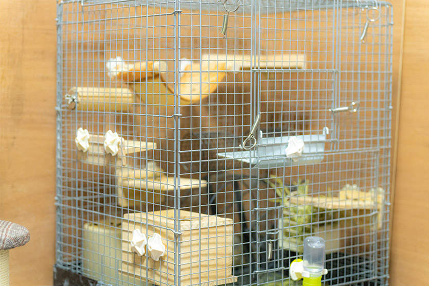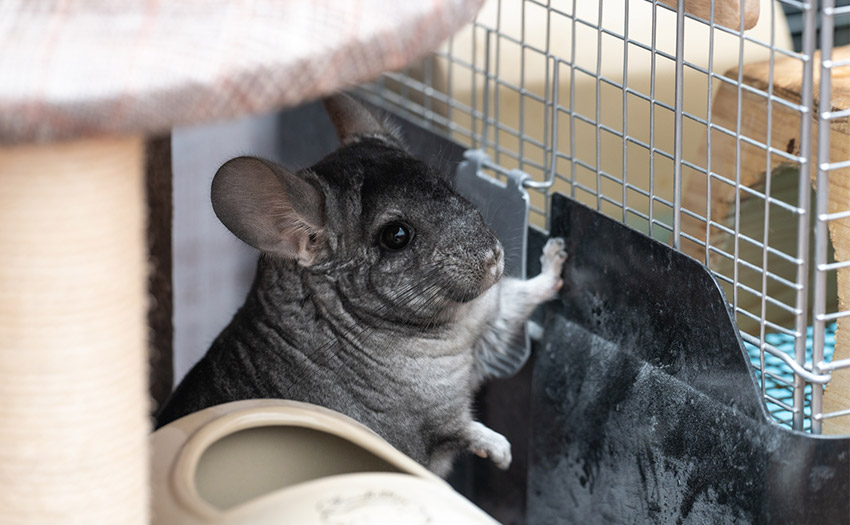 ケージは、ジャンプ力のあるチンチラのために、高さはもちろん面積もゆとりがあるものが望ましいです。飼育する数によっても変わりますが、最低でも幅60cm×高さ60cm×奥行き45cmは必要でしょう。ケージ内の高さが異なる位置に、足場となる棚などを設けてあげると、飛び跳ねてのびのび遊ばせることができます。ケージの網の目が粗いと足を挟んだりするので、網の目が2cm×2cm以下の細かいタイプだと安心です。