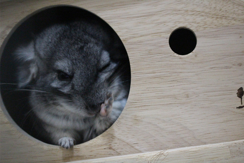 ケージ内にチンチラが隠れられる、小さな家のような巣箱を置くようにします。野生のチンチラは、昼間は岩穴に潜んで眠っているため、このような巣箱を設置してあげる必要があるのです。安心して身を隠せる場所がないと不安になり、ストレスから自咬症(自分をかむ)などの行動を起こすこともあります。複数飼育する場合は、それぞれ一つずつ用意するようにします。巣箱が木製だと自由にかじれる利点がありますが、すぐに傷んでしまうので消耗品と考えて買い替えましょう。