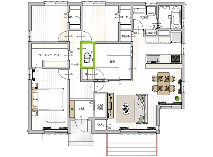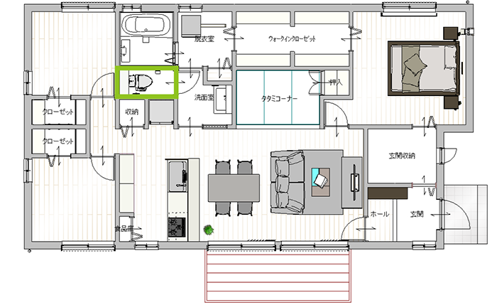 寝室の近くにトイレを設けると、就寝前や起床後、夜中などにトイレに行くときにも便利です。夜間使用時に足元を見えやすくなるため、フットライトなどを導入するとより快適に使えるかもしれません。また上記の間取りでは、リビングや玄関とも比較的近くて利用しやすいのもメリットでしょう。