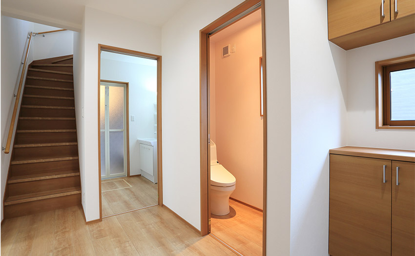 洗面所や浴室の近くにトイレがある間取りでは、リビングやキッチンから目につきにくい位置にトイレを配置できる場合が多い、トイレから出てすぐにしっかりと手洗いができるなどがメリット。水回りがまとまっているため日常動線がシンプルで使い勝手が良いだけでなく、上下水道の配管がまとまり、コストを抑えることができる点も魅力です。