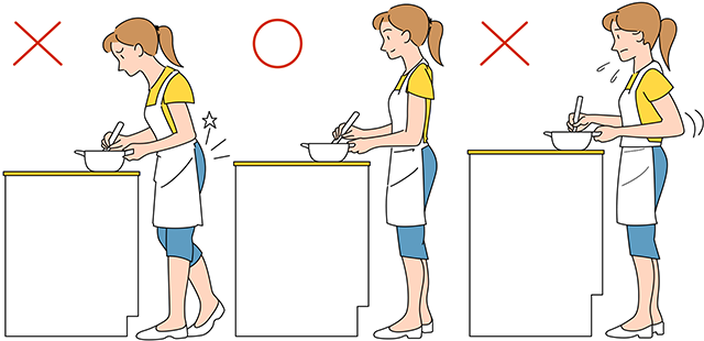 ワークトップが低すぎると背中を丸めて作業することになり、背中や腰の筋肉の緊張が続いて痛みが出る原因に。逆に高すぎると腕の位置を高めにして作業しないといけないため、肩をすくめるような姿勢となり肩こりにつながることもあります。