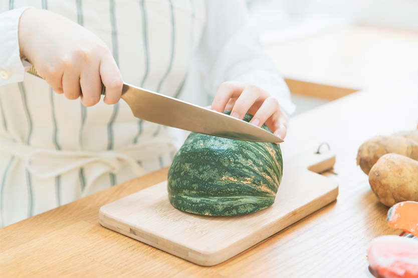 例えば調理でカボチャなどの硬い食材を扱うときは、肩から力を入れて、包丁に体重を載せる感じで切ることも多いはず。しかしワークトップが高いと体重を載せにくく、腕の力で押し切ろうとして包丁が滑ってしまうなど、危険な事態を招きかねません。