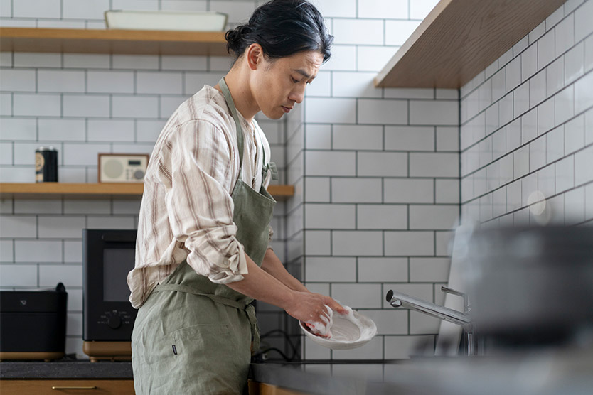 キッチンの高さが低すぎるとシンクでの洗い物の際に前かがみの体勢になりやすくなります。体がシンクに近づく体勢では衣服がシンクのふちに触れやすくなり、濡れてしまうこともあります。
