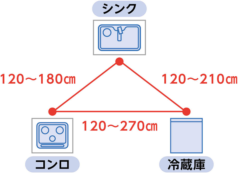 キッチンで調理中に使う頻度が高いシンク、コンロ、冷蔵庫を使いやすい位置に配置することで、移動がスムーズになり、調理を効率的に進められます。一般的にシンク、コンロ、冷蔵庫を三角形の頂点にバランスよく配置した「ワークトライアングル」の配置が良いとされ、3つの頂点を結んだ動線の合計が360cm~600cmの範囲になるのが適切といわれています。