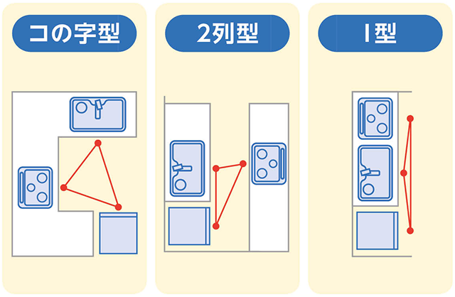 調理や洗い物をしながら洗濯や部屋の掃除をするなど、生活の中でキッチンと他の部屋を行き来することは多いもの。またキッチンではシンク、コンロ、冷蔵庫の間を頻繁に移動するため、それぞれの配置も重要になります。
