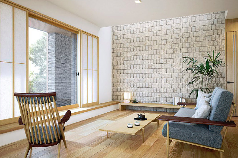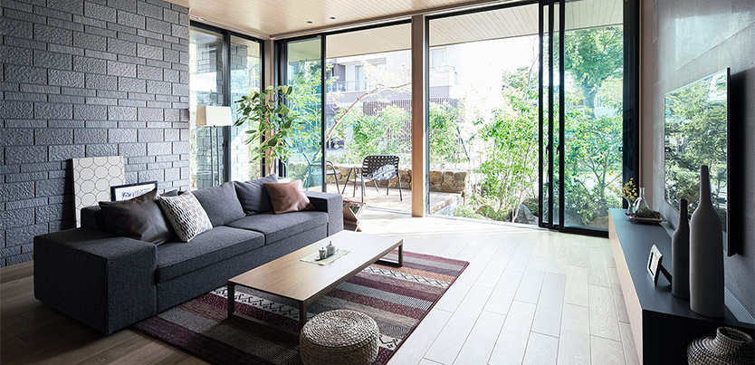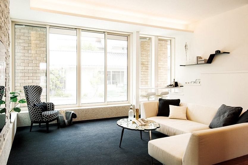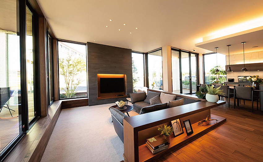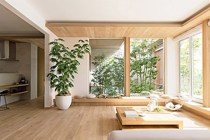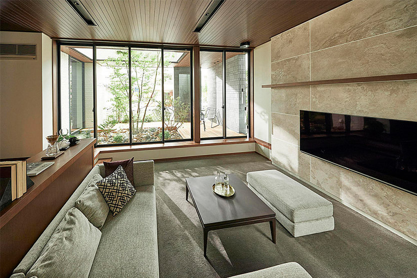 ダイワハウスの「グランリビング」なら、1階または1・2階とも2m72cmの天井高※3が実現でき、天井の高い広々とした開放的なリビングや、壁や柱が少ない大空間が可能です。また、天井高いっぱいの大開口「グランフルサッシ」から外に広がる中庭の景色を眺め、部屋の奥まで自然光をたっぷりと取り入れられます。「天井の高さ」と「窓の大きさ」の二つの特長を兼ね備えたリビングにすることができます。