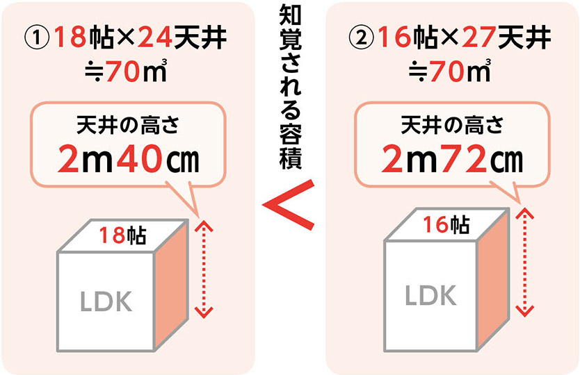 実際に、臥位での実験ではありますが、同じ容積の空間であっても、床面積が狭く天井が高い部屋と、床面積が広く天井が低い部屋では、天井が高い部屋の方が「知覚される容積」が広くなることもあるそう※2。